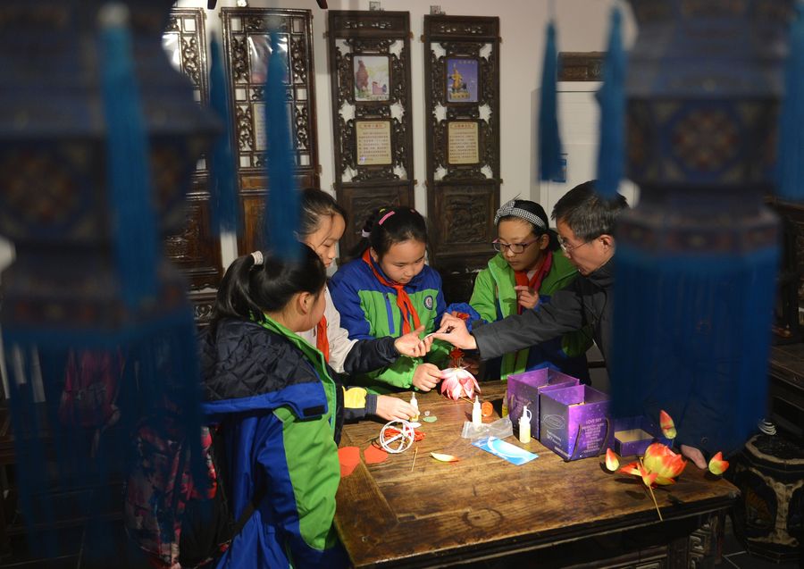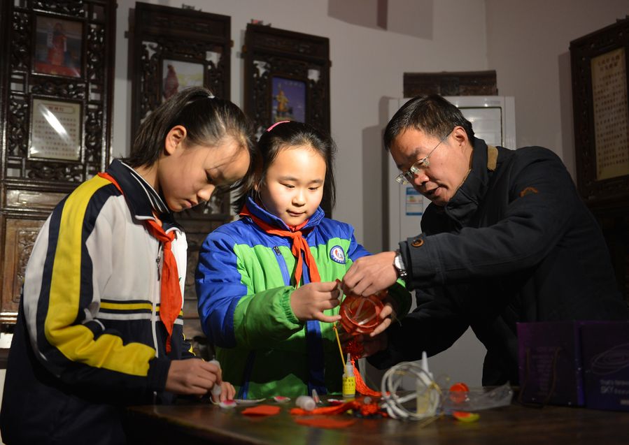 Zhang Juntao makes lanterns with visiting pupils at a lantern museum of Bianjing Lantern Zhang set up by himself in Kaifeng City, central China's Henan Province, Nov. 27, 2019. (Xinhua/Ren Pengfei)