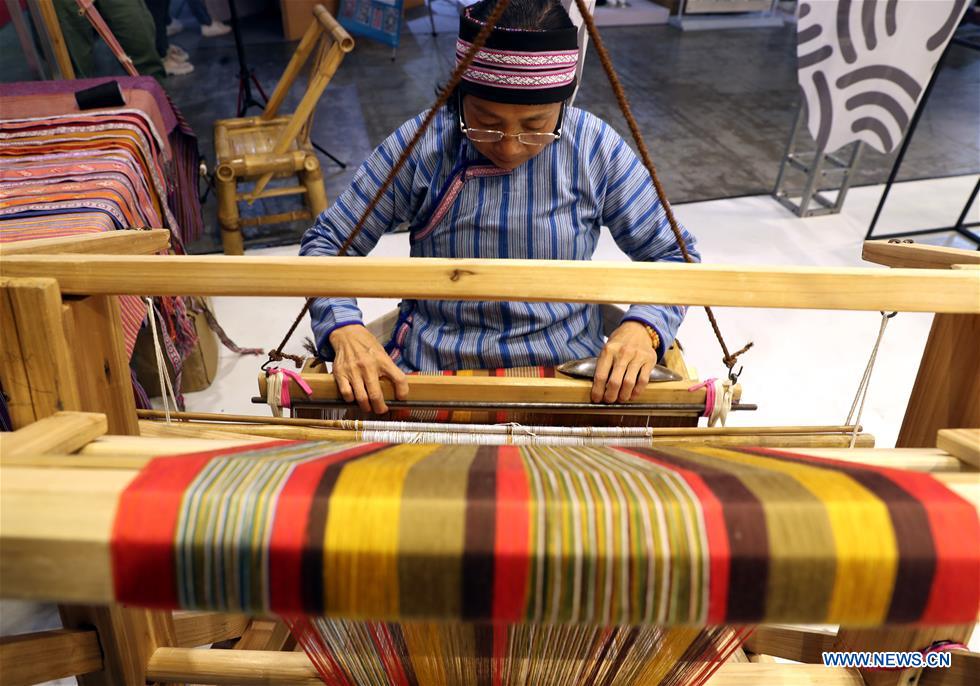 A craftswoman shows traditional weaving skills at Shanghai International Hobby&Craft Expo in east China's Shanghai, Nov. 29, 2019. The three-day Shanghai International Hobby&Craft Expo kicked off here on Friday. (Xinhua/Liu Ying)