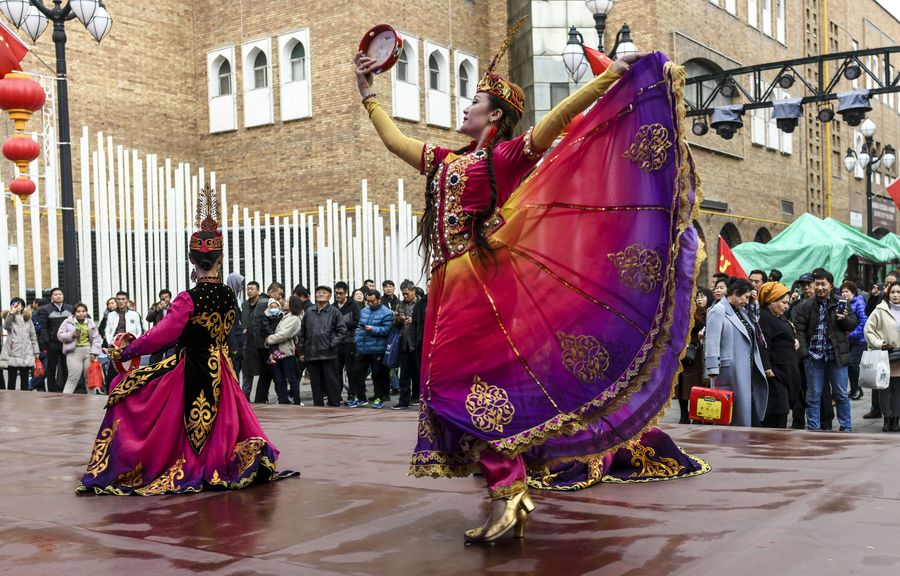 Tourists watch dancing performance at the Xinjiang International Grand Bazaar in Urumqi, northwest China's Xinjiang Uygur Autonomous Region, Nov. 7, 2019. (Xinhua/Wang Fei)