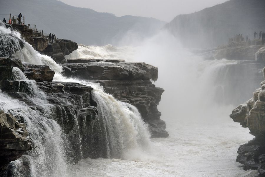 Tourists take photos at the Hukou Waterfall scenic spot, Dec. 14, 2019. (Xinhua/Tao Ming)