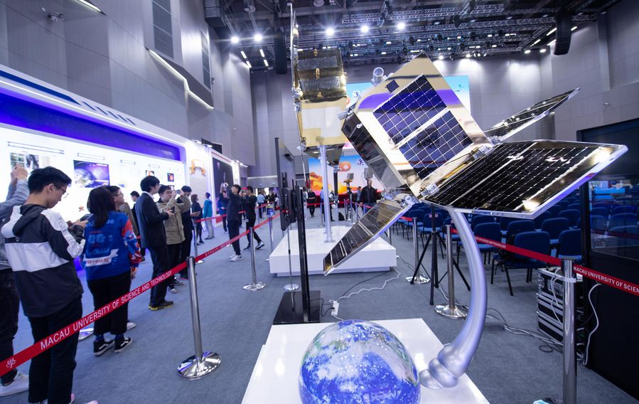 Visitors view exhibits at an aerospace exhibition marking the 20th anniversary of Macao's return to the motherland at Macao University of Science and Technology in Macao, south China, Dec. 15, 2019. (Xinhua/Cheong Kam Ka)