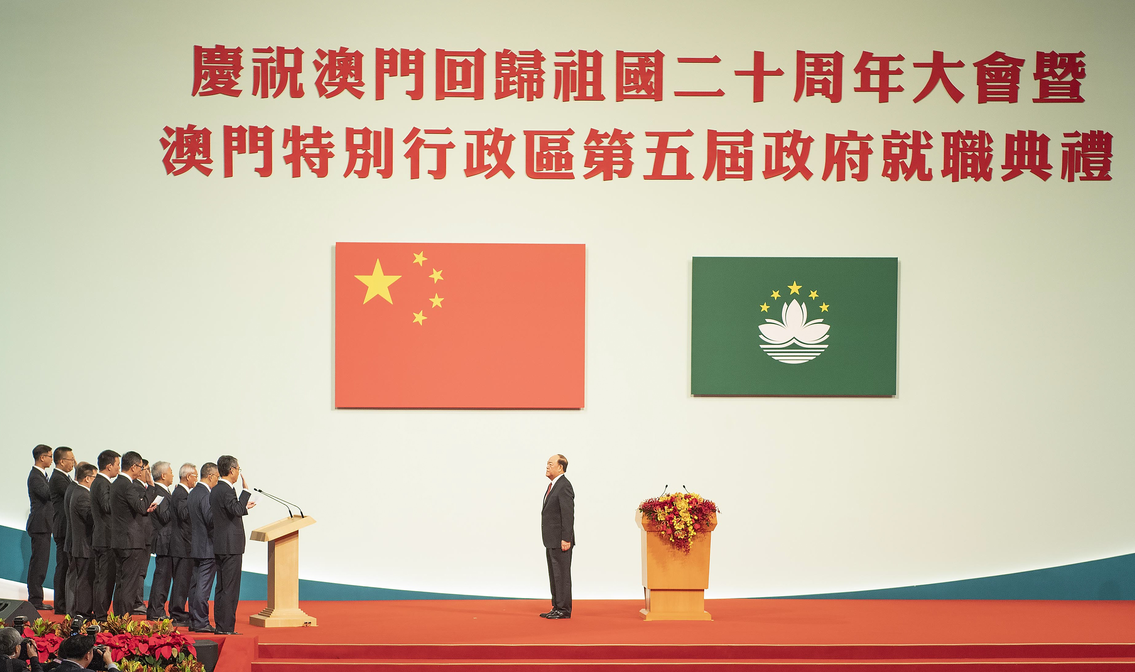 Officiated by Ho Iat Seng, the fifth-term chief executive of the Macao Special Administrative Region (SAR), members of the executive council of Macao SAR are sworn in at a gathering in celebration of the 20th anniversary of Macao's return to the motherland and the inauguration of the fifth-term government of the Macao SAR, at the Macao East Asian Games Dome in south China's Macao, Dec. 20, 2019. (Xinhua/Li Tao)