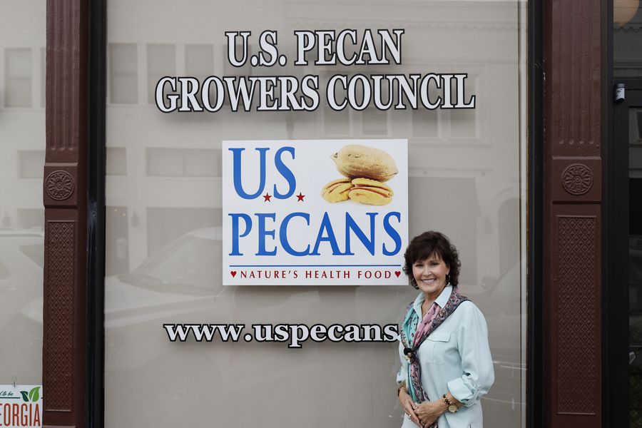 Janice Dees, executive director and international marketing manager of U.S. Pecan Growers Council, poses for a photo outside her office in Tifton, Georgia, the United States, Oct. 25, 2019. (Xinhua/Li Muzi)