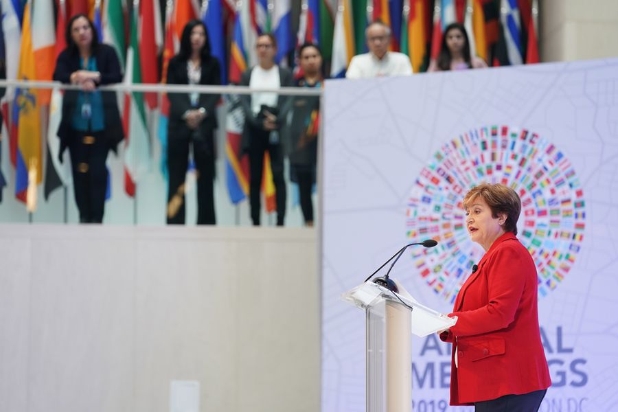 Kristalina Georgieva, chief of the International Monetary Fund (IMF), delivers a speech in Washington D.C., the United States, Oct. 8, 2019. (Xinhua/Liu Jie)