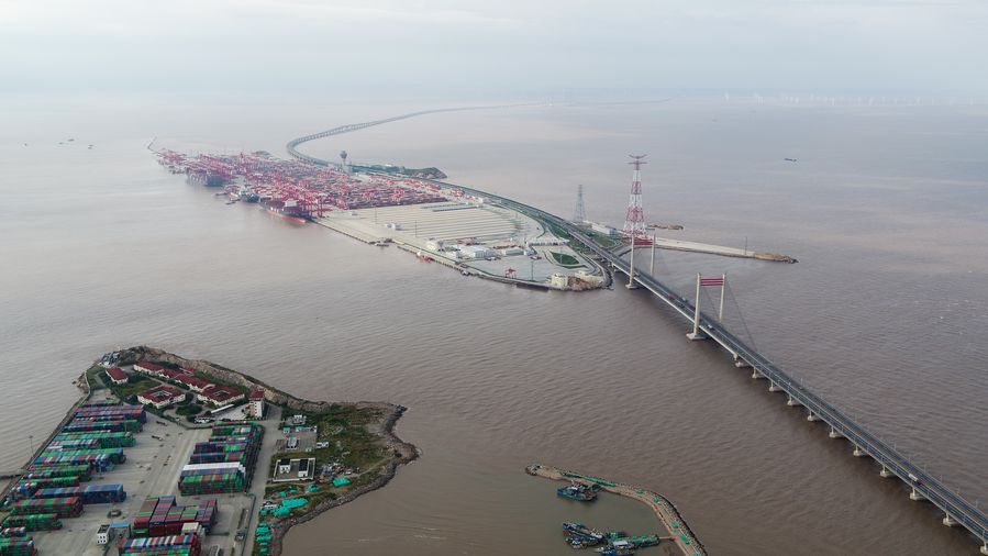 Aerial photo taken on Oct. 16, 2019 shows the Yangshan Deep Water Port of east China's Shanghai. (Xinhua/Ding Ting)