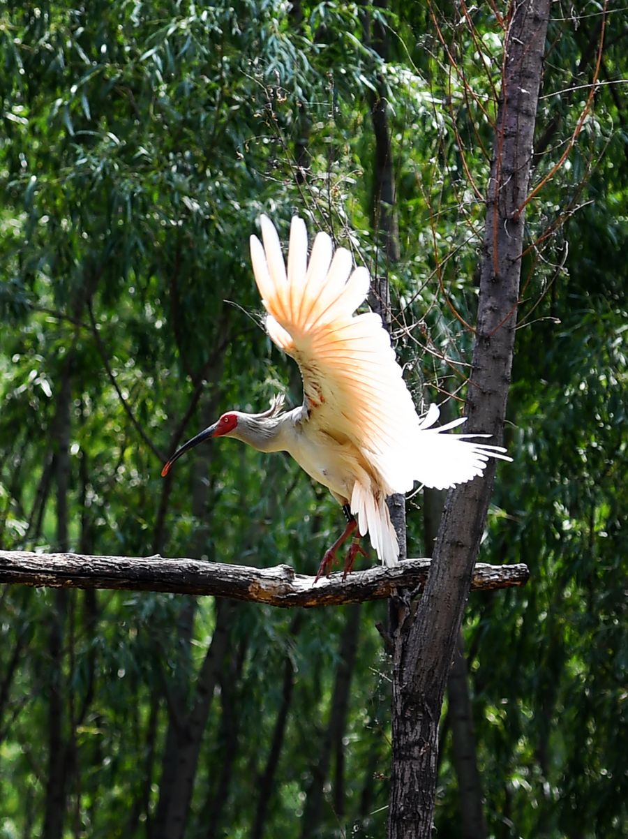 A crested ibis is seen at a wild training base in Tongchuan City, northwest China's Shaanxi Province, June 13, 2019. (Xinhua/Liu Xiao)