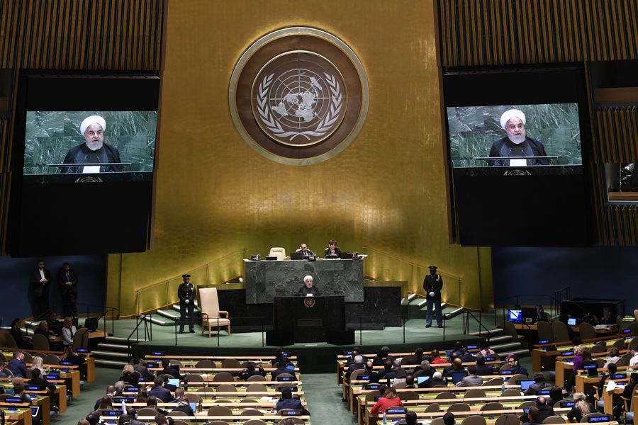 Iranian President Hassan Rouhani (C) addresses the General Debate of the 74th session of the UN General Assembly at the UN headquarters in New York, on Sept. 25, 2019. Rouhani on Wednesday ruled out negotiations with the United States unless the latter lifts sanctions on his country first. (Xinhua/Liu Jie)