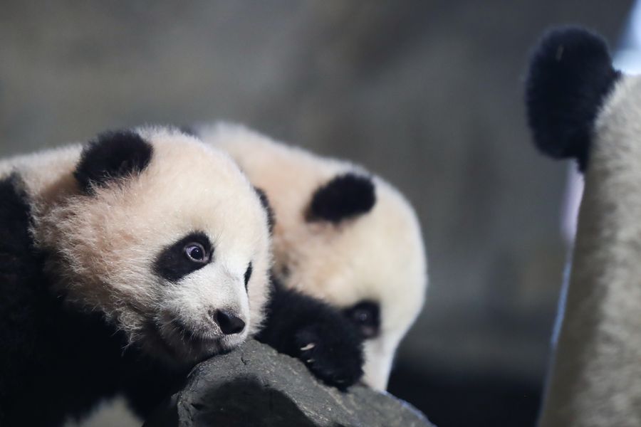 Giant panda cubs Bao Di and Bao Mei rest at the Pairi Daiza zoo in Brugelette, Belgium, Dec. 31, 2019.