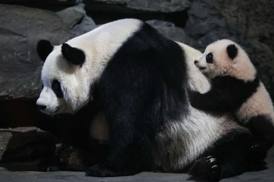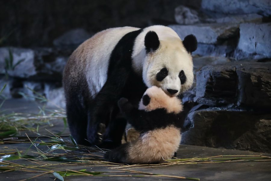 Giant panda Hao Hao plays with one of her cubs at the Pairi Daiza zoo in Brugelette, Belgium, Dec. 31, 2019. (Xinhua/Zhang Cheng)