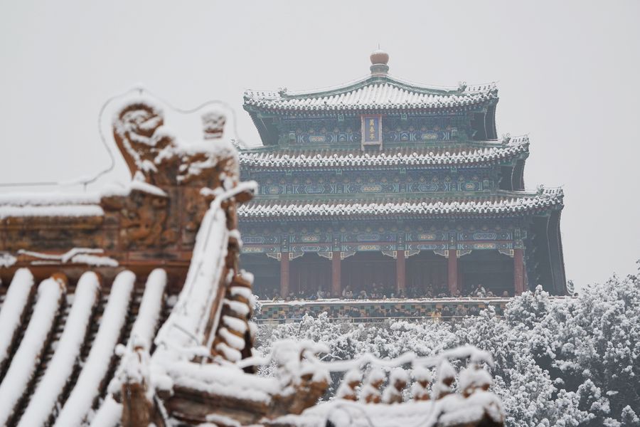 The snow scenery at Jingshan Park in Beijing, Jan. 6, 2020. Beijing on Sunday embraced the first snowfall this year. (Xinhua/Ju Huanzong)