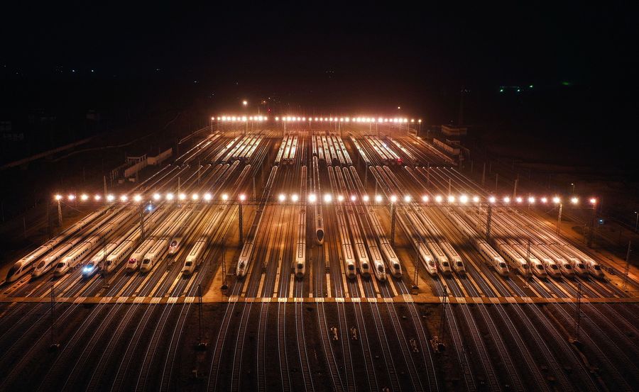 Photo taken on Jan. 10, 2020 shows electric multiple unit (EMU) trains ready for the Spring Festival travel rush in Nanning, south China's Guangxi Zhuang Autonomous Region. (Xinhua/Cao Yiming)