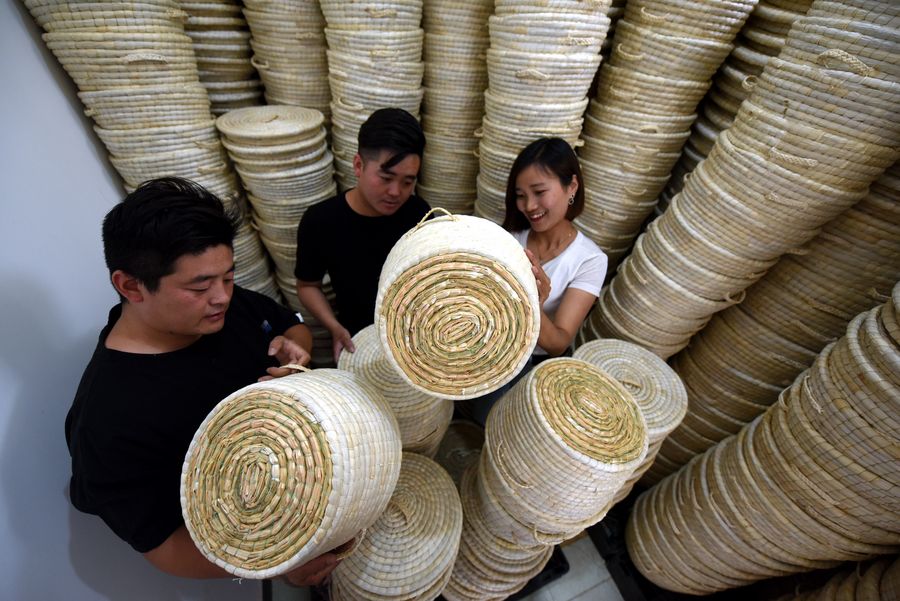 Local salesperson Hong Yuanmin (R) introduces straw handicrafts to customers in Matou Township, Tancheng County, Linyi City of east China's Shandong Province, May 28, 2019. (Xinhua/Fang Dehua)