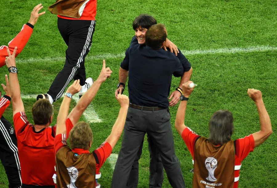 German head coach Joachim Loew (facing) and assistant coach Hansi Flick celebrate their team's 1-0 lead during the FIFA World Cup 2014 final between Germany and Argentina at the Estadio do Maracana in Rio de Janeiro, Brazil, 13 July 2014.