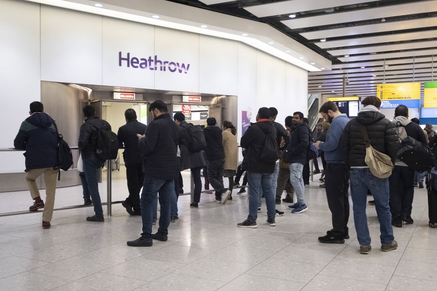 People wait outside the arrivals of Heathrow Airport in London, Britain on Jan. 22, 2020. (Photo by Ray Tang/Xinhua)