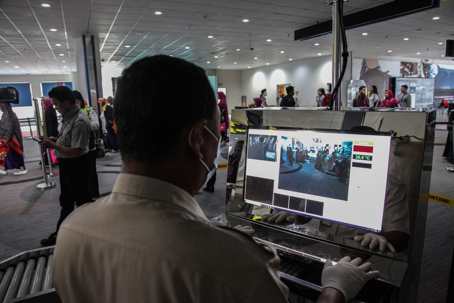 A staff member looks at a computer monitor to check passengers' body temperature through a thermal scanner upon their arrival at Kualanamu International Airport in North Sumatra, Indonesia, Jan. 22, 2020. (Photo by Alberth Damanik/Xinhua)