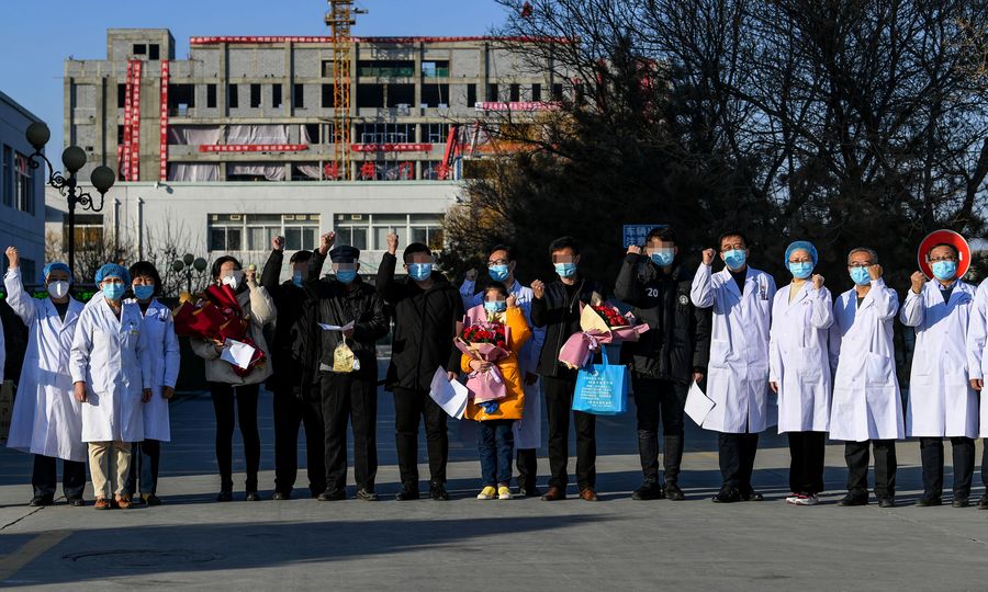 Cured patients and medical workers pose for a group photo at the Fourth People's Hospital of Ningxia Hui Autonomous Region in Yinchuan, capital of the region, Feb. 8, 2020. Ten patients of the novel coronavirus pneumonia were cured and discharged from the hospital in Ningxia on Saturday. (Xinhua/Feng Kaihua)