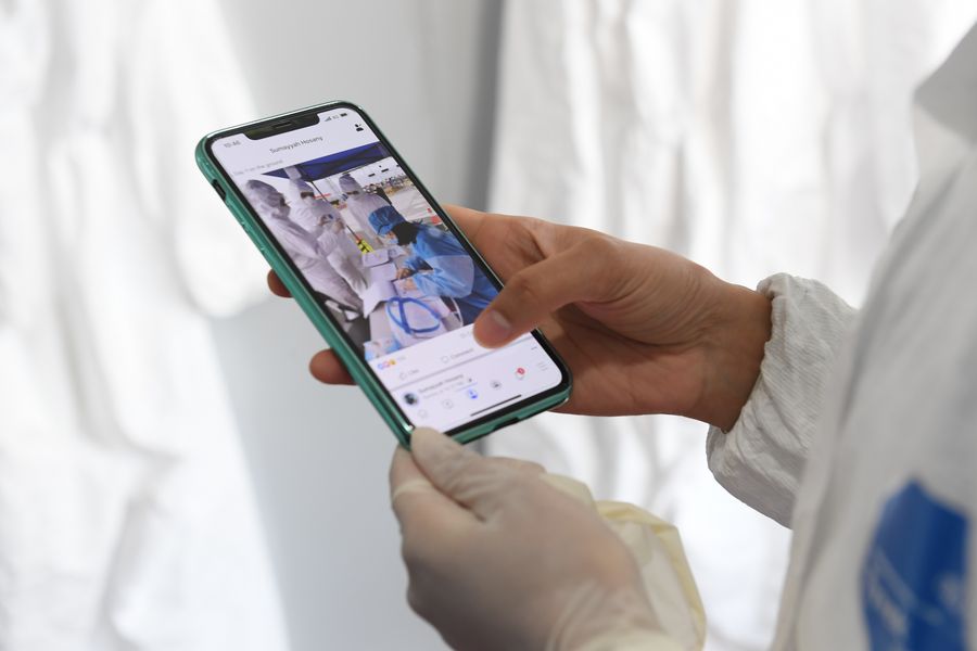 Mauritian Hosany Sumayyah posts pictures about her work with Chinese colleagues on social media during work break at a novel coronavirus prevention-and-control checkpoint of an expressway exit in Wenzhou, east China's Zhejiang Province, Feb. 8, 2020.(Xinhua/Weng Xinyang)