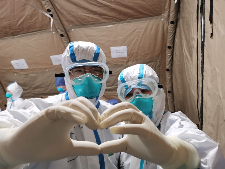 Mobile photo taken on Feb. 14, 2020 shows Gao Yongzhe (L) and Huang Wenli posing for a photo gesturing a heart-shaped sign at "Wuhan Livingroom" in Wuhan, central China's Hubei Province. Doctor Gao Yongzhe and nurse Huang Wenli are a couple working at the frontline against the novel coronavirus. (Photo by Gao Xiang/Xinhua)