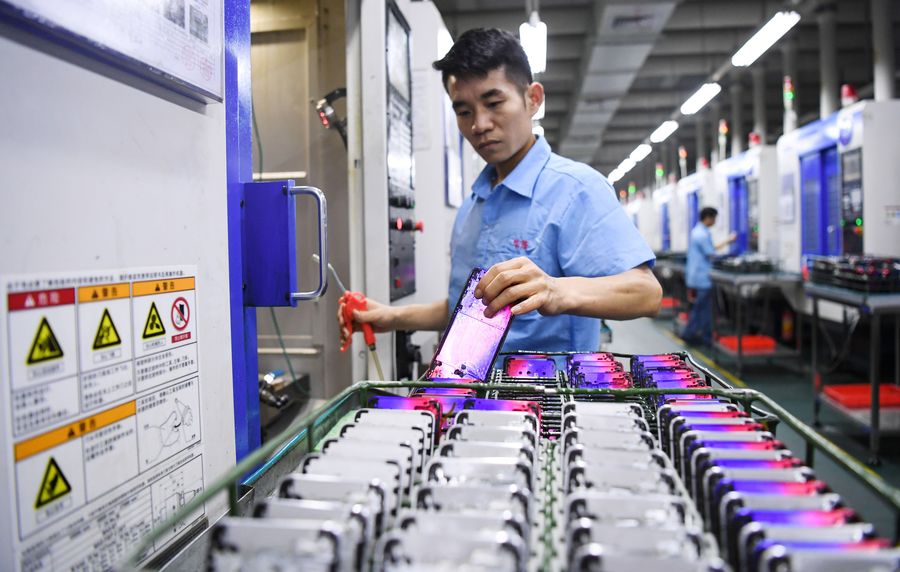 Photo taken on July 16, 2019 shows a workshop producing mobile phone frame parts at Huamao Electronics Group in Chang'an Town of Dongguan, south China's Guangdong Province. (Xinhua/Deng Hua)