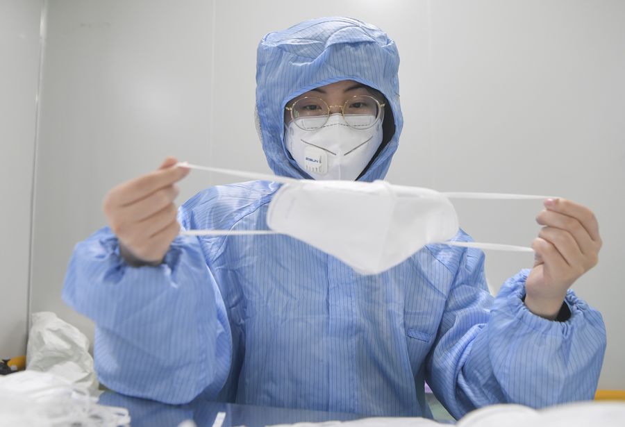 A worker checks a medical N95 mask at a mask factory in southwest China's Chongqing, Feb. 17, 2020. (Xinhua/Wang Quanchao)