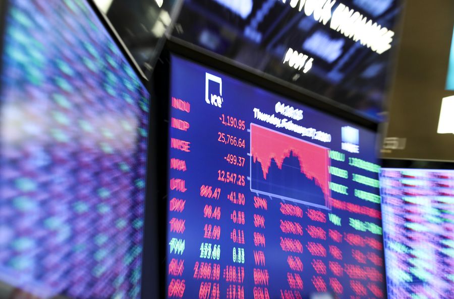 An electronic screen shows the trading data at the New York Stock Exchange in New York, the United States, Feb. 27, 2020. U.S. stocks closed sharply lower on Thursday as investors fled the stocks market and flocked into safe-haven assets. (Xinhua/Wang Ying)
