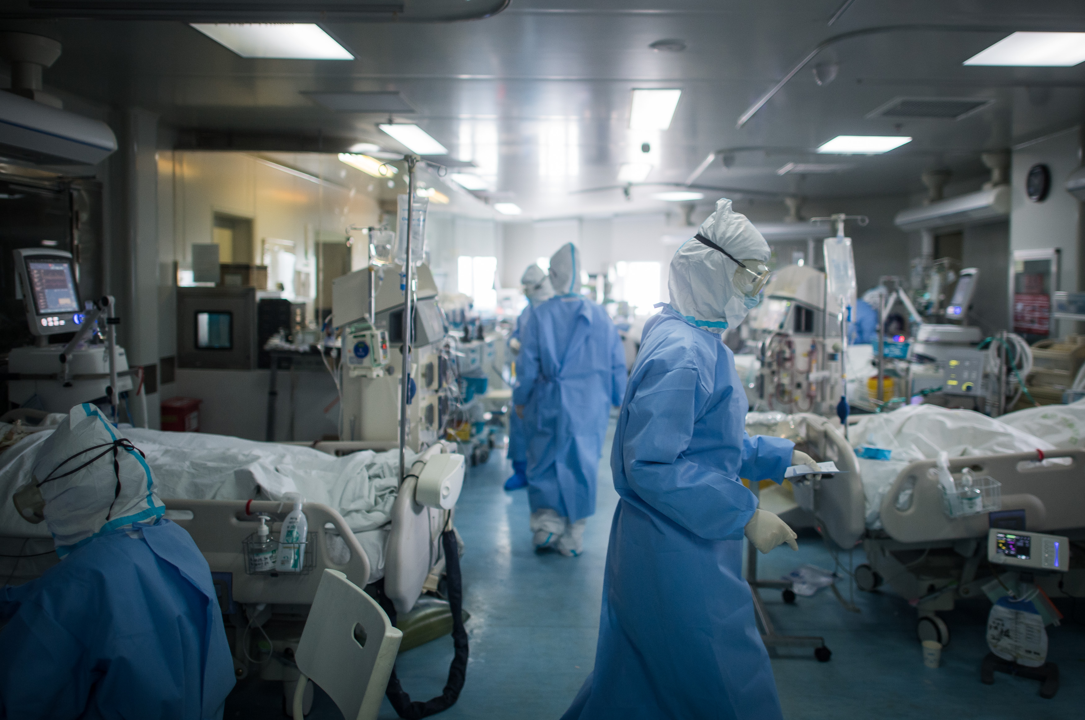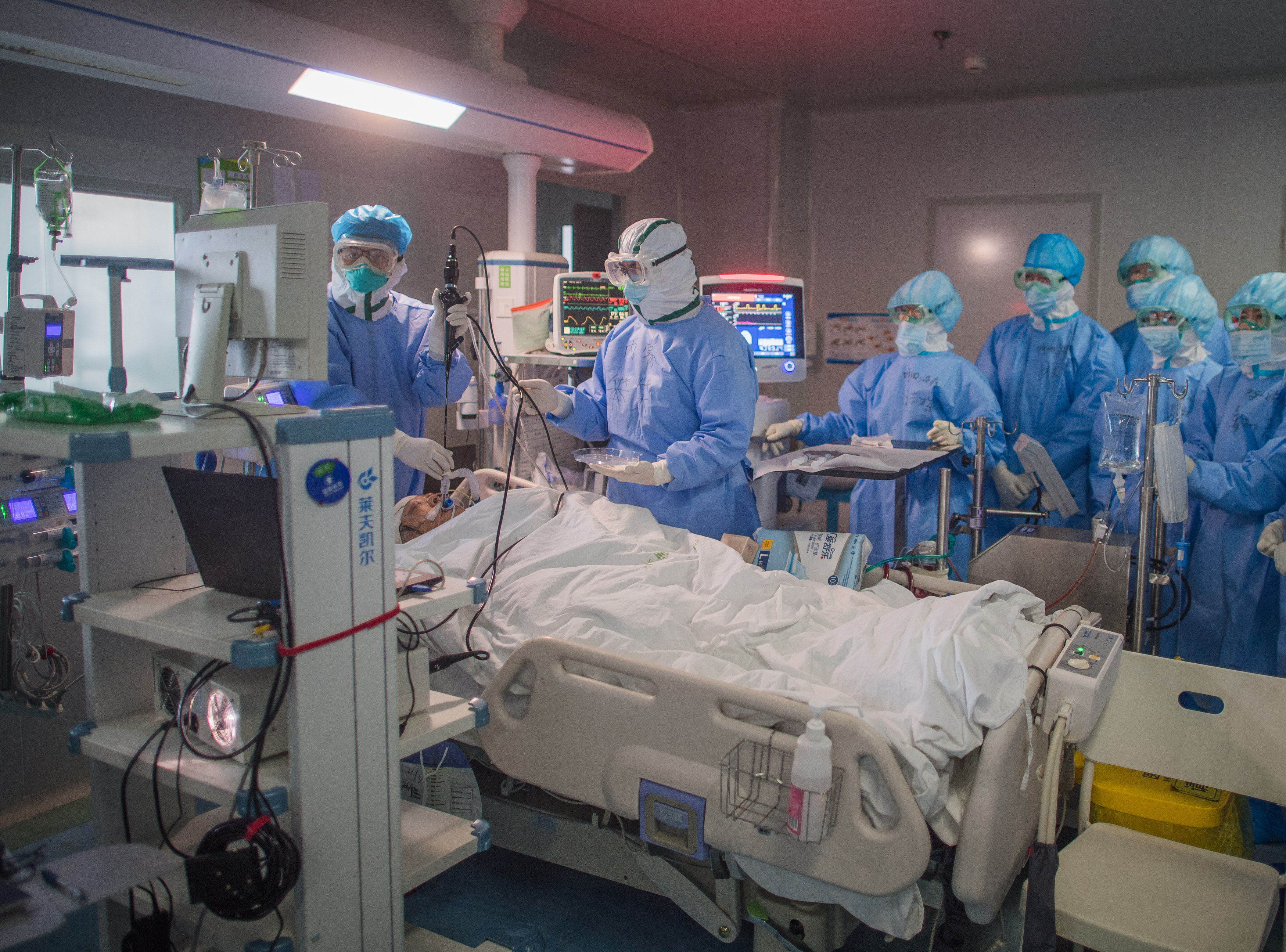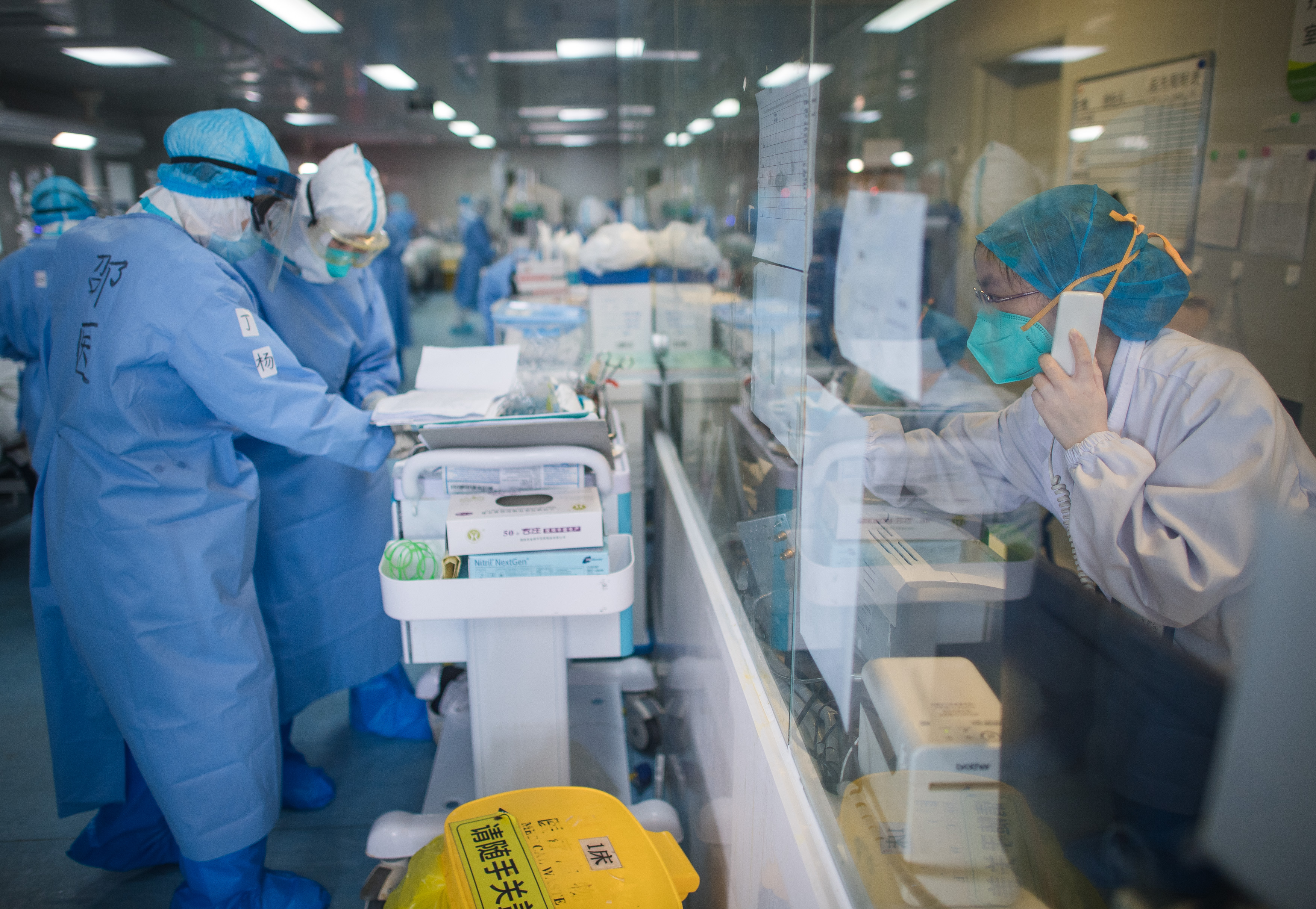 Medical workers are busy at the ICU (intensive care unit) of Wuhan pulmonary hospital in Wuhan, central China's Hubei Province, March 19, 2020. (Xinhua/Xiao Yijiu)