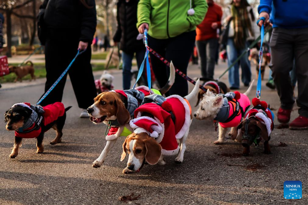 Participants walk with their dogs during an annual "Santa Dog Walk" event at the City Park in Budapest, Hungary on Dec. 6, 2025. The Christmas-themed event brings together dog owners from across the city for a seasonal walk, promoting responsible pet ownership and encouraging outdoor activities for families and their pets. (Photo by David Balogh/Xinhua)