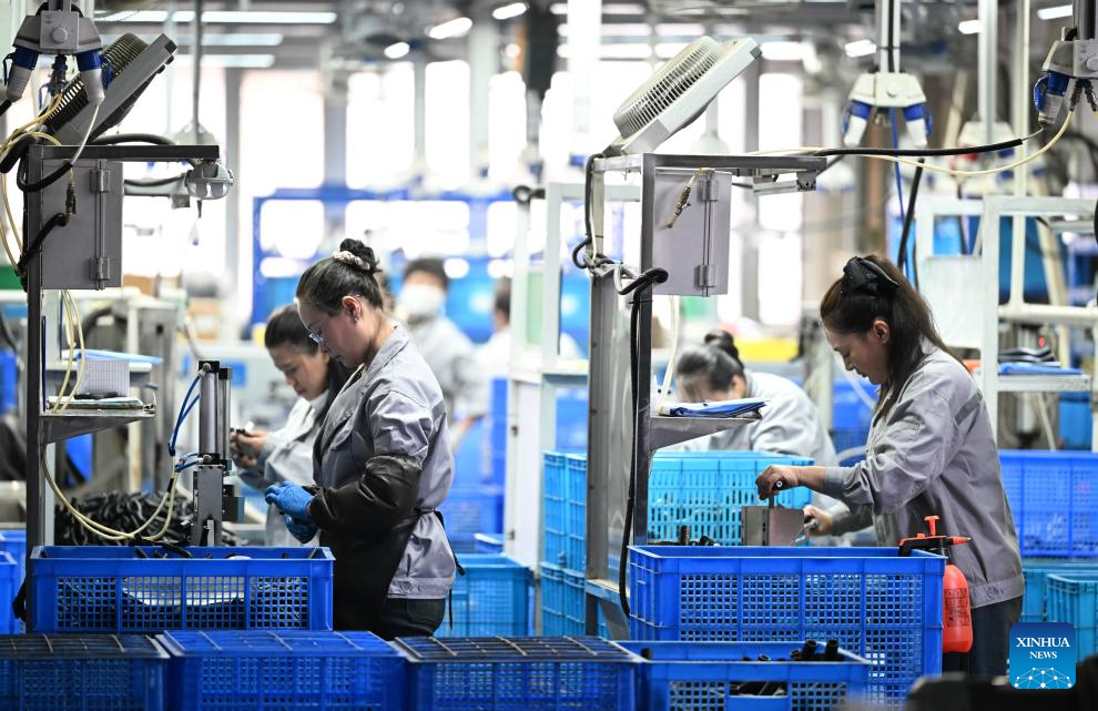 A staff member checks an automotive rubber hose at a workshop of Pengling Co., Ltd. in the town of Zhongtang, on the outskirts of Tianjin, north China, Nov. 5, 2025. (Xinhua/Zhao Zishuo)