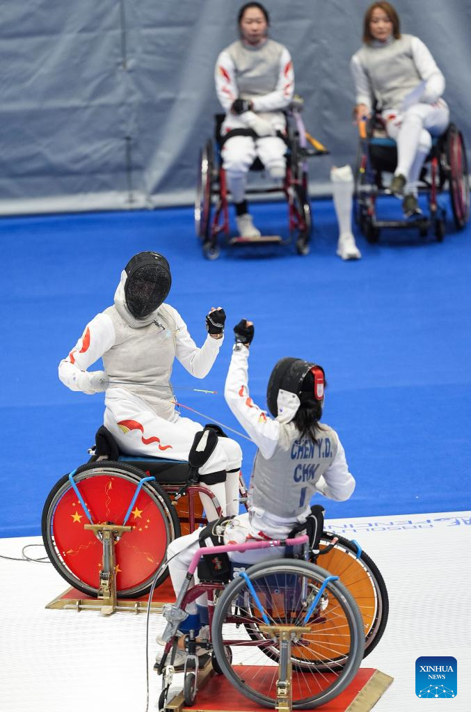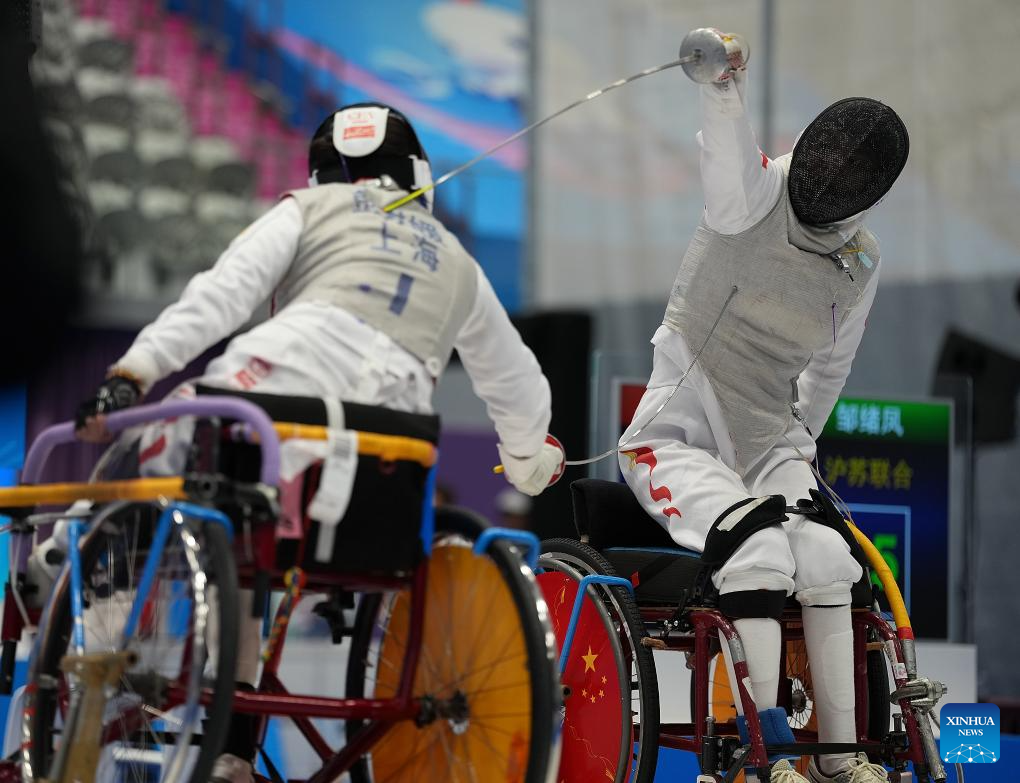 Zou Xufeng (L) of team Shanghai-Jiangsu competes against Chen Yuandong of team Shanghai during the women's foil team gold medal match of wheelchair fencing at China's 12th National Games for Persons with Disabilities and the 9th National Special Olympic Games in Hong Kong, south China, Dec. 10, 2025. (Xinhua/Hou Jun)
