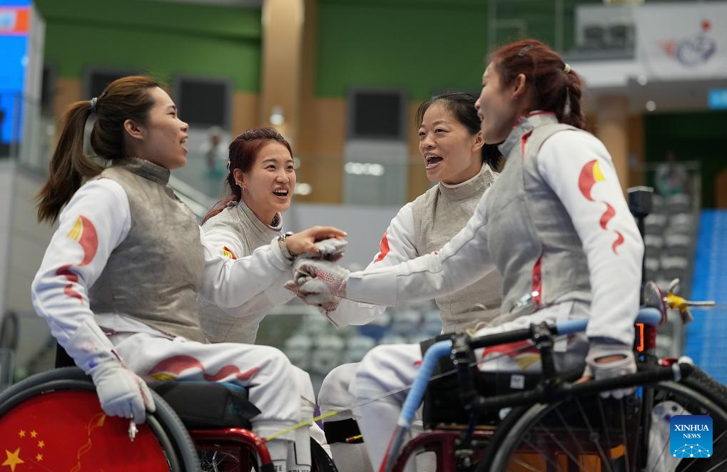 Kang Su, Gu Haiyan, Zou Xufeng, Xiao Rong (from L to R) of team Shanghai-Jiangsu react before the women's foil team gold medal match of wheelchair fencing at China's 12th National Games for Persons with Disabilities and the 9th National Special Olympic Games in Hong Kong, south China, Dec. 10, 2025. (Xinhua/Hou Zhaokang)