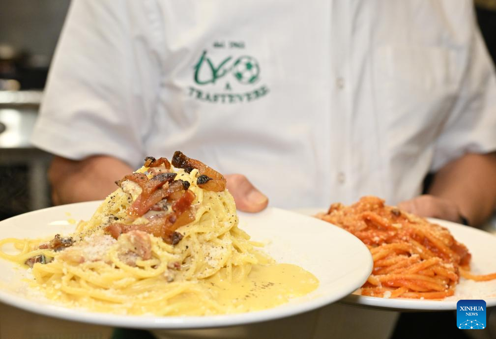 This photo taken on Dec. 11, 2025 shows Spaghetti alla carbonara (L) and Bucatini all'amatriciana at a restaurant named Ivo a Trastevere in Rome, Italy. (Photo by Alberto Lingria/Xinhua)