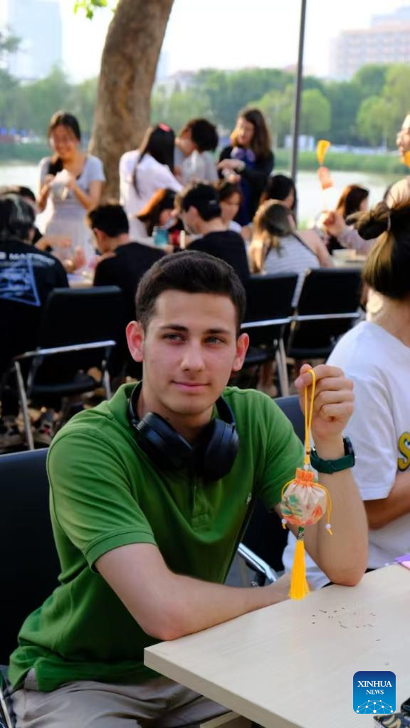 This photo taken in June 2025 shows Azerbaijani youth Ravanov Eldar, known in China as He Yan, participating in a herbal sachet making activity at Tianjin University in north China's Tianjin. (Xinhua)