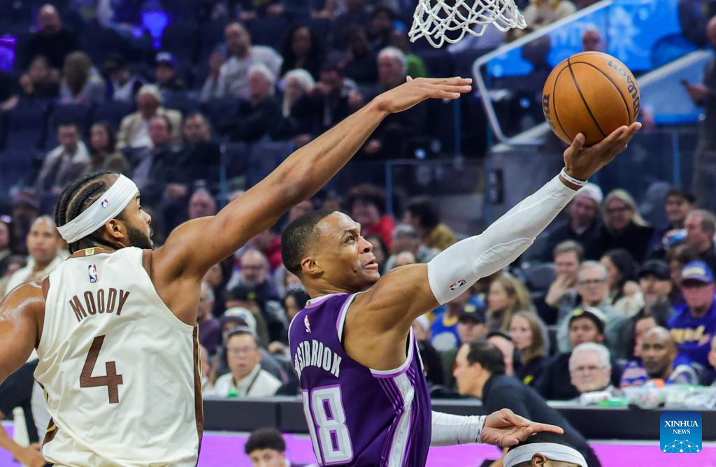 Sacramento Kings' Russell Westbrook (R) goes to the basket against Golden State Warriors' Moses Moody during the 2025-2026 NBA regular season basketball game between Golden State Warriors and Sacramento Kings in San Francisco, the United States, Jan. 9, 2026. (Photo by Arthur Dong/Xinhua)