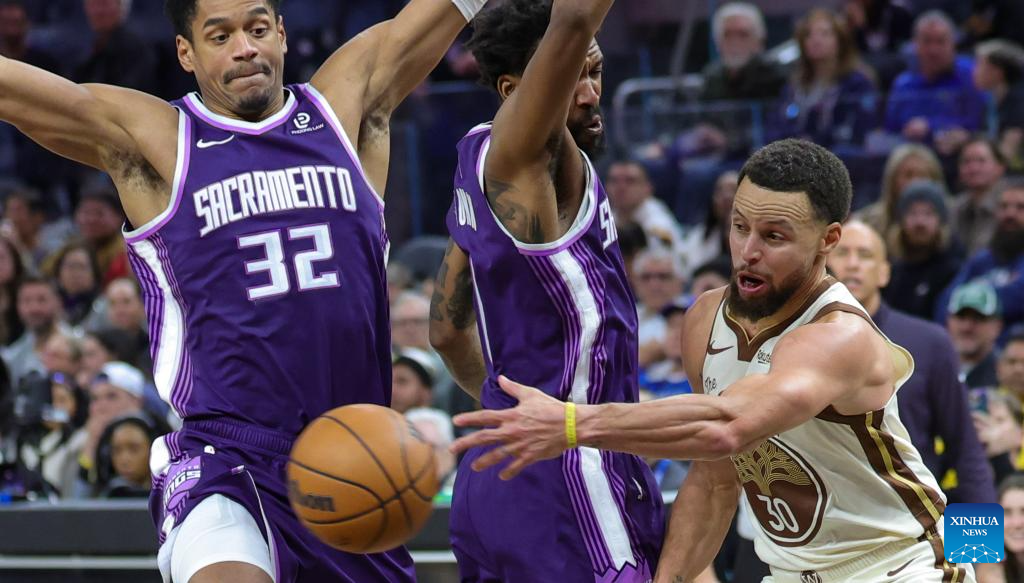 Golden State Warriors' Stephen Curry (R) passes the ball during the 2025-2026 NBA regular season basketball game between Golden State Warriors and Sacramento Kings in San Francisco, the United States, Jan. 9, 2026. (Photo by Arthur Dong/Xinhua)