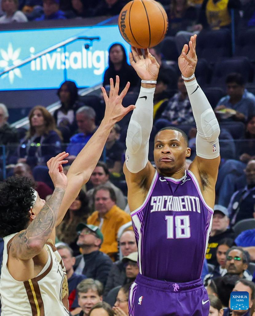 Sacramento Kings' Russell Westbrook (R) shoots during the 2025-2026 NBA regular season basketball game between Golden State Warriors and Sacramento Kings in San Francisco, the United States, Jan. 9, 2026. (Photo by Arthur Dong/Xinhua)