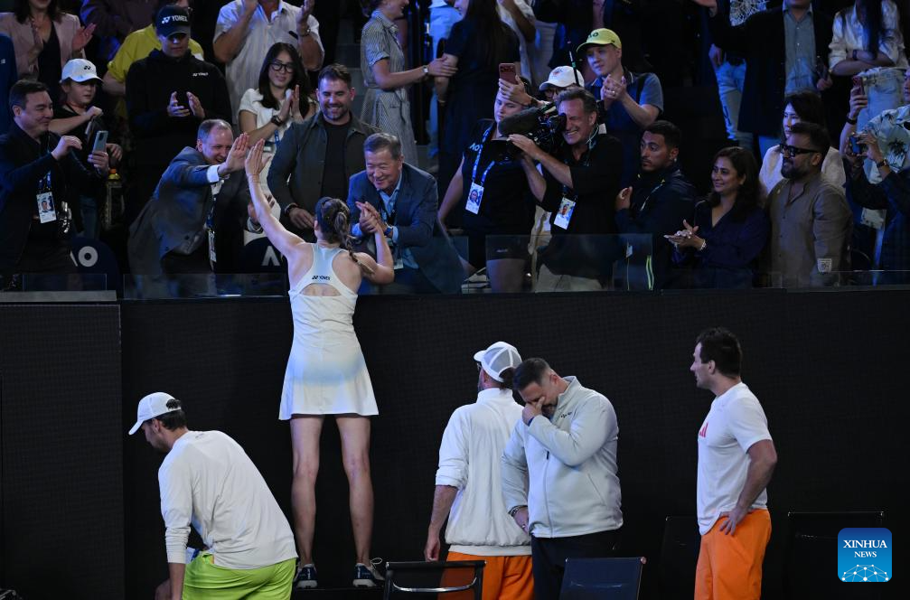 Elena Rybakina (2nd L, front) interacts with the audience after the women's singles final between Elena Rybakina of Kazakhstan and Aryna Sabalenka of Belarus at the Australian Open tennis tournament in Melbourne, Australia, Jan. 31, 2026. (Photo by Wang Shen/Xinhua)