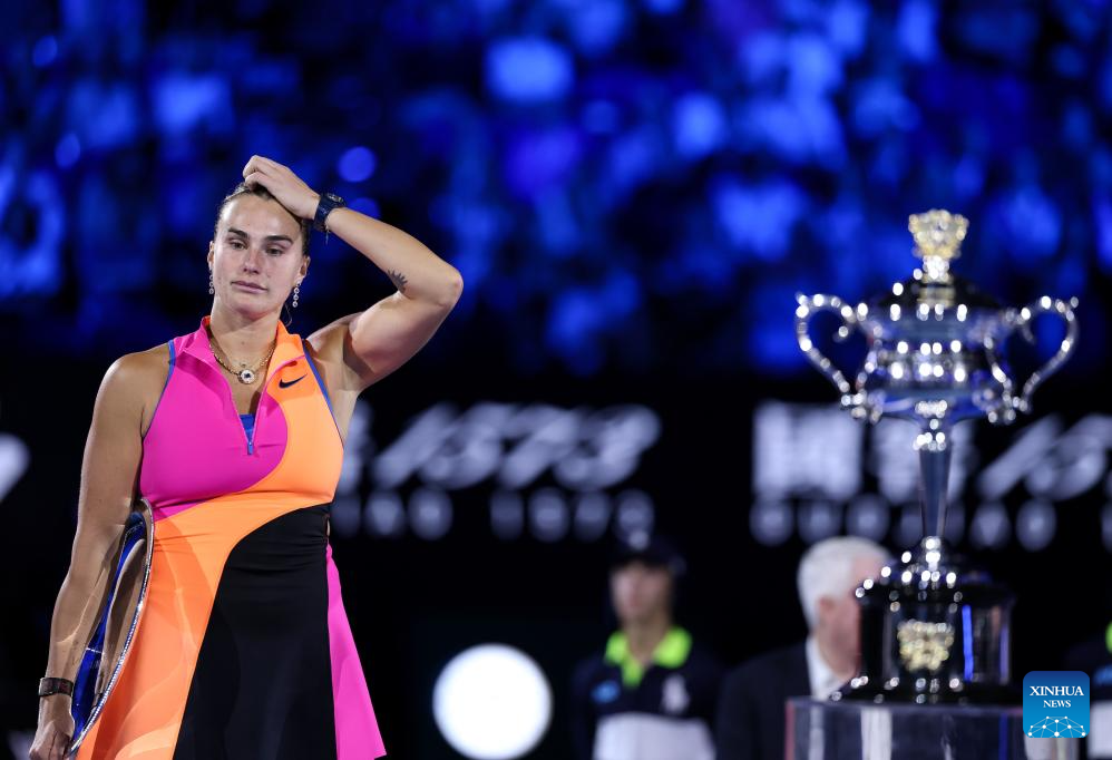 Aryna Sabalenka is seen during the awarding ceremony after the women's singles final between Elena Rybakina of Kazakhstan and Aryna Sabalenka of Belarus at the Australian Open tennis tournament in Melbourne, Australia, Jan. 31, 2026. (Xinhua/Ma Ping)