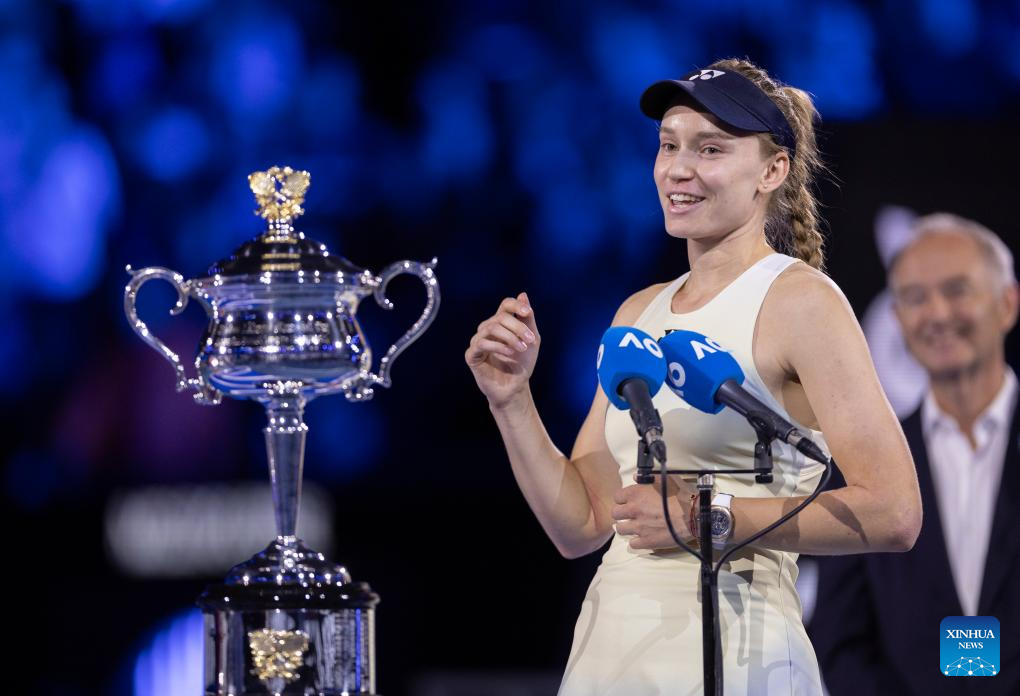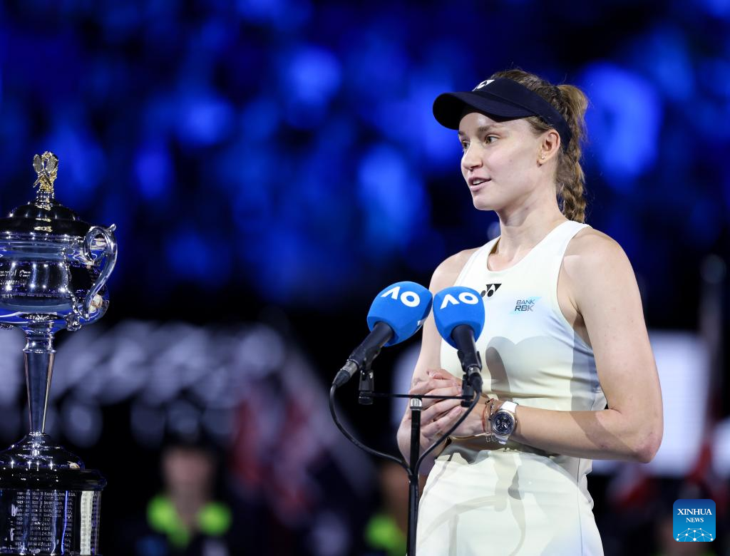 Elena Rybakina speaks during the awarding ceremony after the women's singles final between Elena Rybakina of Kazakhstan and Aryna Sabalenka of Belarus at the Australian Open tennis tournament in Melbourne, Australia, Jan. 31, 2026. (Xinhua/Ma Ping)