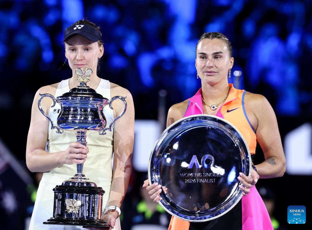 Elena Rybakina (L) and Aryna Sabalenka pose with the trophy during the awarding ceremony after the women's singles final between Elena Rybakina of Kazakhstan and Aryna Sabalenka of Belarus at the Australian Open tennis tournament in Melbourne, Australia, Jan. 31, 2026. (Xinhua/Ma Ping)