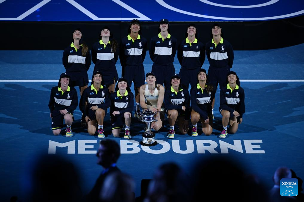 Elena Rybakina poses with the ball kids after the women's singles final between Elena Rybakina of Kazakhstan and Aryna Sabalenka of Belarus at the Australian Open tennis tournament in Melbourne, Australia, Jan. 31, 2026. (Photo by Wang Shen/Xinhua)