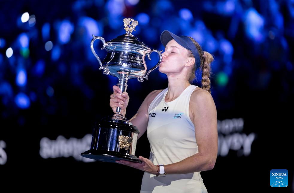 Elena Rybakina poses with the trophy during the awarding ceremony after the women's singles final between Elena Rybakina of Kazakhstan and Aryna Sabalenka of Belarus at the Australian Open tennis tournament in Melbourne, Australia, Jan. 31, 2026. (Xinhua/Ma Ping)