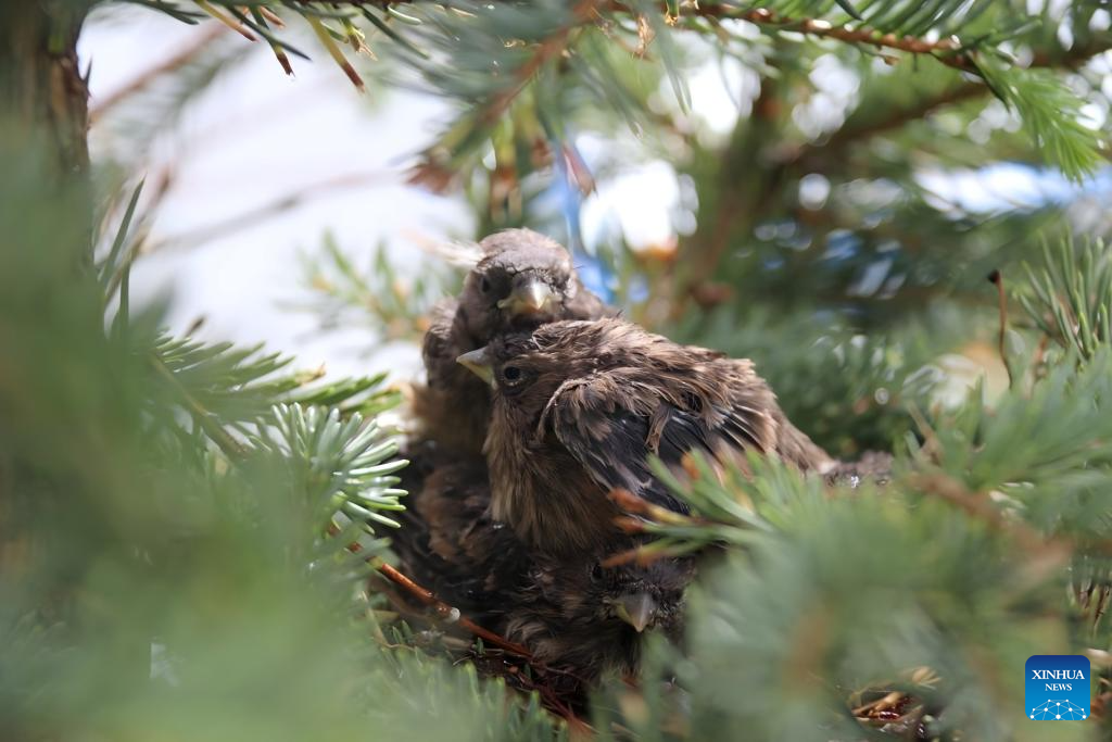 This undated photo shows snow finches resting on a nest in a spruce tree in Nagqu, southwest China's Xizang Autonomous Region. (Xinhua)