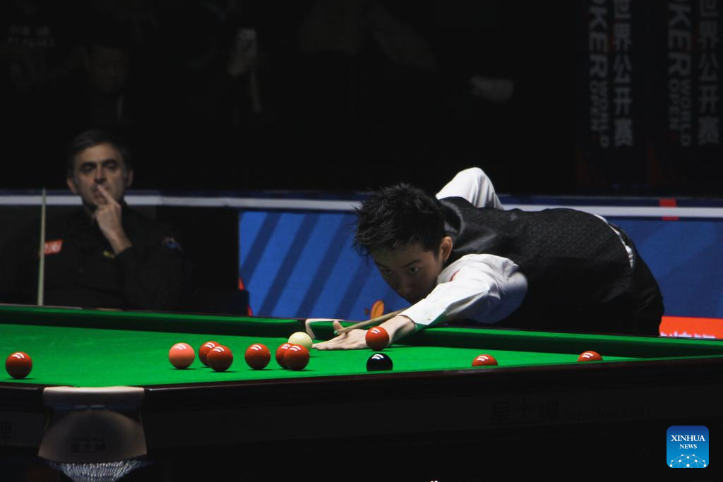Wu Yize (R) competes during the semifinal between Ronnie O'Sullivan of England and Wu Yize of China at World Snooker Open 2026 in Shangrao, east China's Jiangxi Province, March 21, 2026. (Xinhua/Chen Junwu)