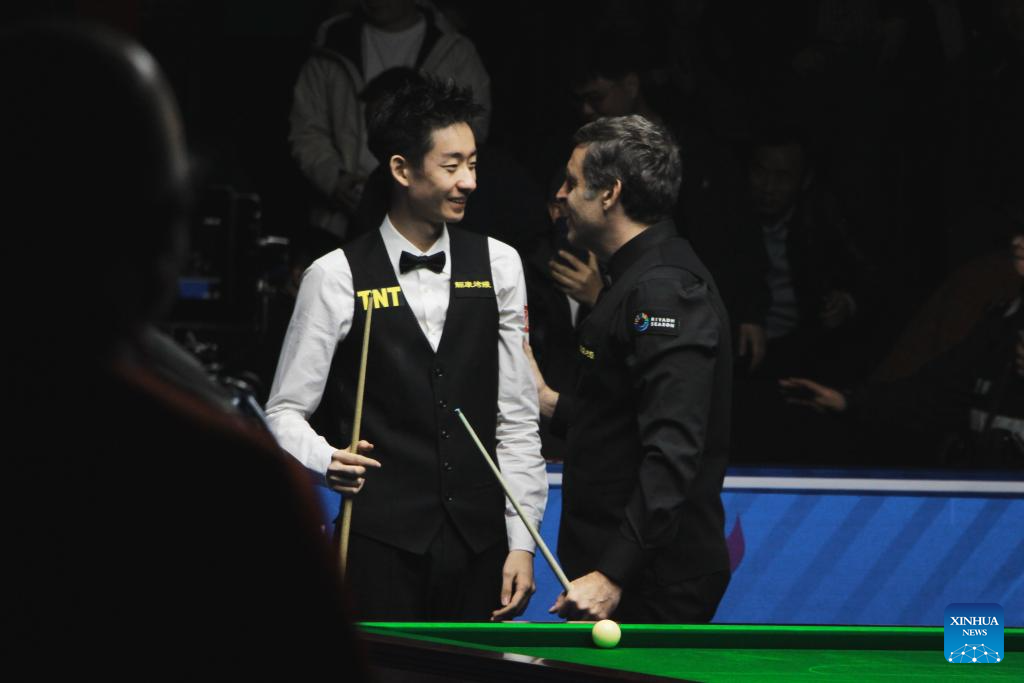 Ronnie O'Sullivan (R) talks with Wu Yize after the semifinal between Ronnie O'Sullivan of England and Wu Yize of China at World Snooker Open 2026 in Shangrao, east China's Jiangxi Province, March 21, 2026. (Xinhua/Chen Junwu)