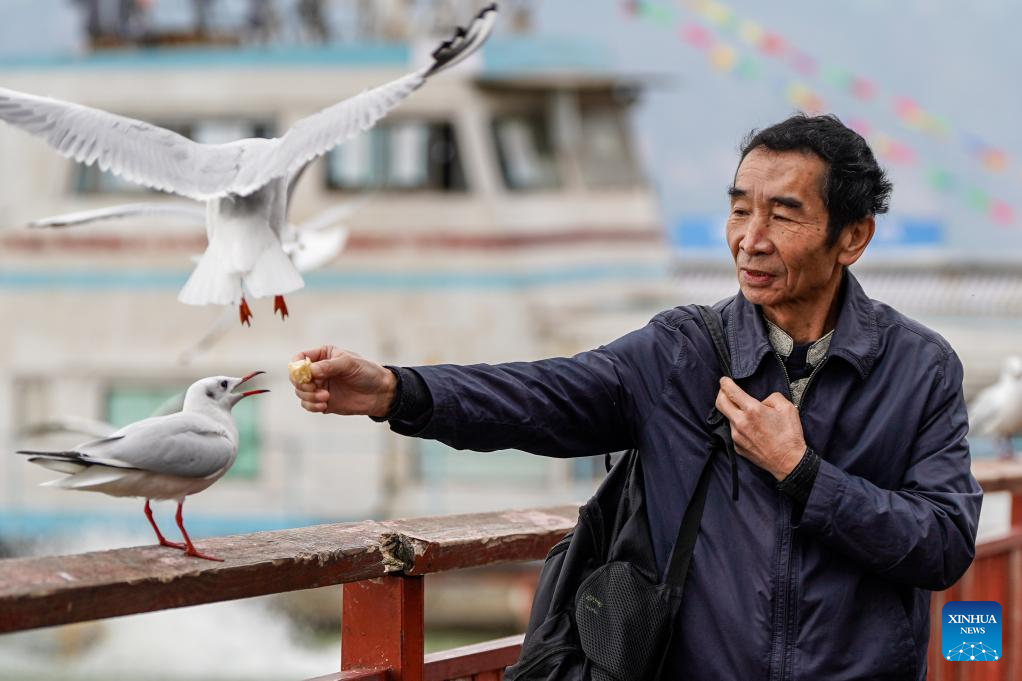 A tourist feeds black-headed gulls at the Haigeng east pier by the Dianchi Lake in Kunming, southwest China's Yunnan Province, on Dec. 11, 2025. (Xinhua/Peng Yikai)