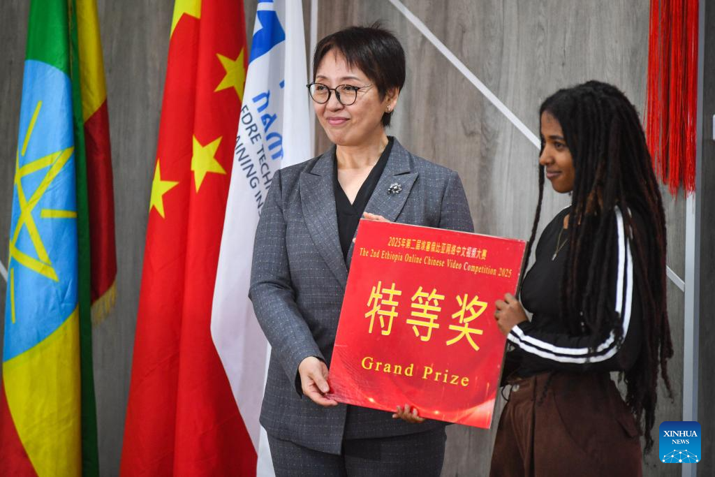 Zhang Yawei (L), cultural counselor at the Chinese Embassy in Ethiopia, presents a prize to a winner at an award ceremony of the Second Ethiopia Online Chinese Video Competition, in Addis Ababa, Ethiopia, on Dec. 11, 2025. The Chinese Embassy in Ethiopia on Thursday announced winners of the Second Ethiopia Online Chinese Video Competition at a ceremony held at the Ethiopian Technical and Vocational Training Institute in Addis Ababa. (Photo by Michael Tewelde/Xinhua)
