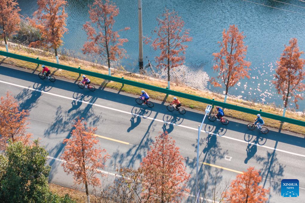 An aerial drone photo taken on Dec. 7, 2025 shows cyclists riding on a road in Fanyang Township, Fanchang District, Wuhu, east China's Anhui Province. (Photo by Xiao Benxiang/Xinhua)