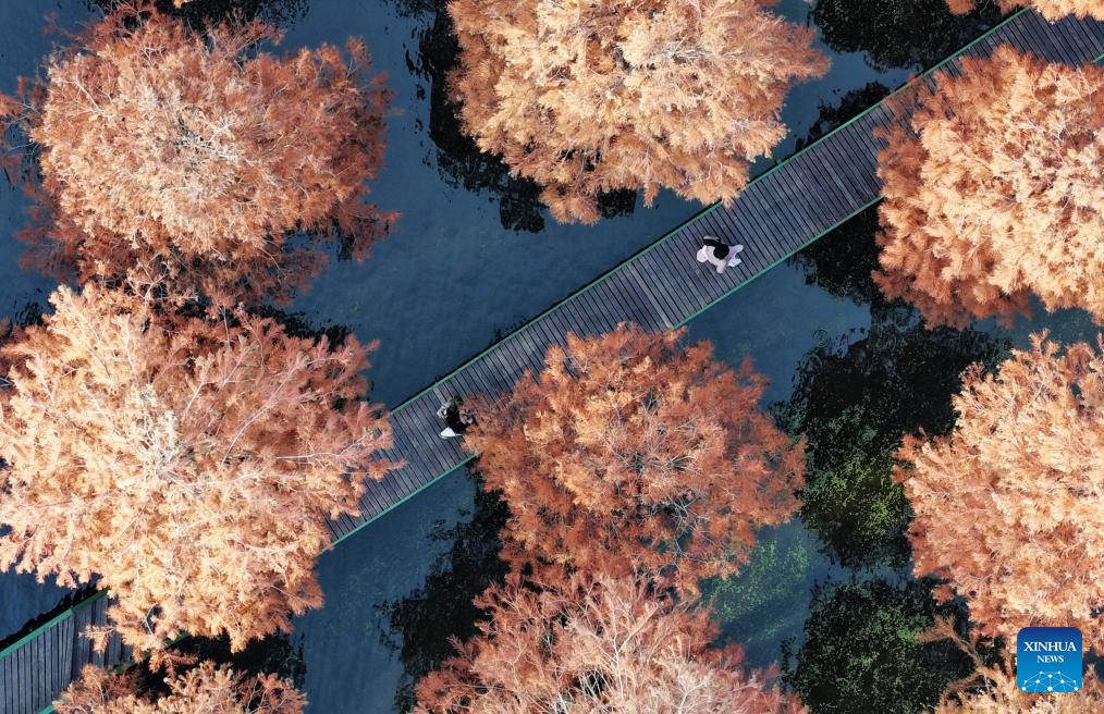 Tourists enjoy their leisure time at a wetland park in Yangzhou City, east China's Jiangsu Province, Dec. 9, 2025. (Photo by Meng Delong/Xinhua)
