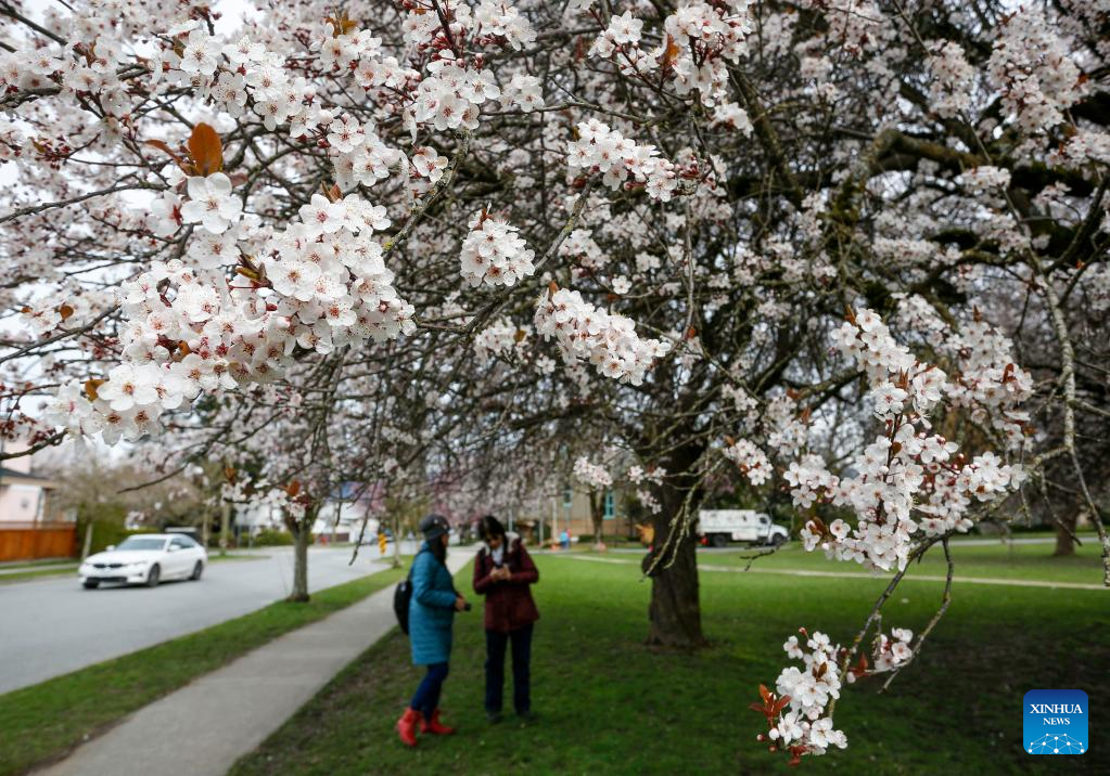 People look at cheery blossoms in Vancouver, British Columbia, Canada, on March 24, 2022. There are approximately 43,000 cherry trees in Metro Vancouver. (Photo by Liang Sen/Xinhua)