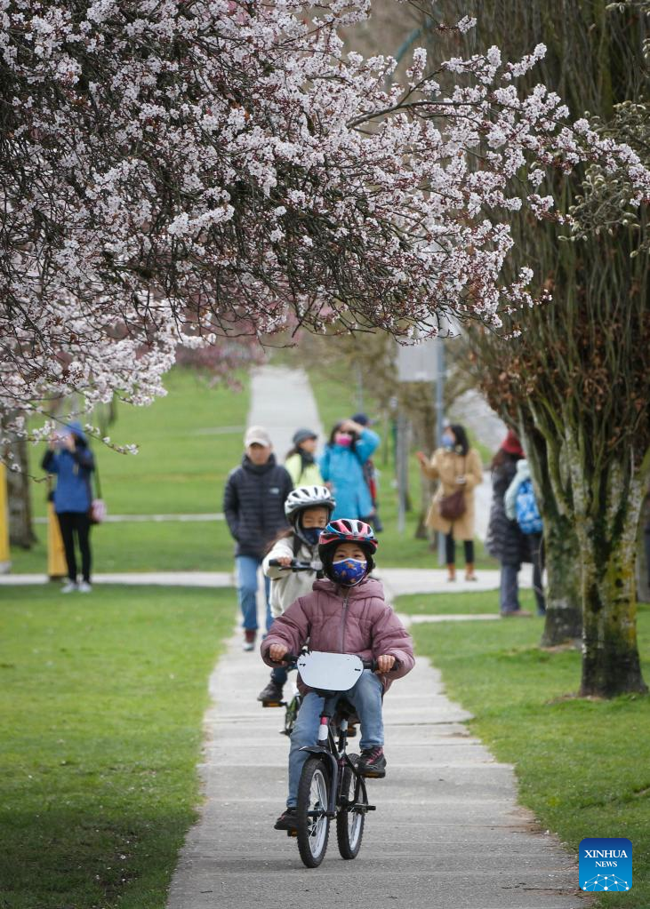 Children ride bicycles under cherry blossoms in Vancouver, British Columbia, Canada, on March 24, 2022. There are approximately 43,000 cherry trees in Metro Vancouver. (Photo by Liang Sen/Xinhua)